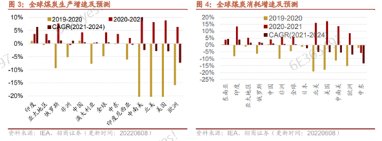 再看全球的,在21年疫情后,全球煤炭消费反弹,总消耗量达到79.06亿吨,同比增长6%,2021年全球燃煤发电量达到历史最高水平。
