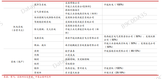 中期看,合资企业共同研发的如航电系统、机电系统中的相关结构零部件不断优化,这部分也或将出现国产替代,如中航电子、中航机电等零部件制造商是这部分的。