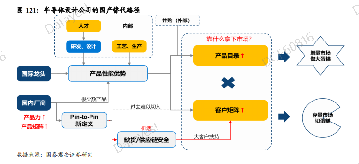 同样,国内四大领域也在加速国产替代:信创方面,国产化率政策在驱动,PC及服务器CPU等的进口替代。数据中心方面,是依托云计算企业投资建设加码。智能汽车方面:是在智能驾驶趋势下,加速发展车载芯片。安防方面,龙头受制裁,叠加海思缺位,芯片国产化率高。