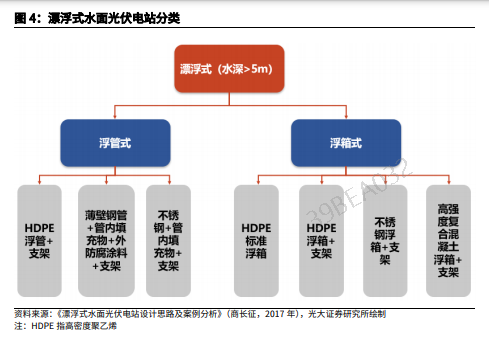 水面光伏电站还分为两种——桩基固定式和漂浮式两大类,一般情况下,若水深小于5m则采用打桩架高式安装,水深5m以上就采用漂浮式安装。