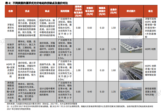 浮管式的总造价约为1.50元/W,浮箱式约是1.70元/W左右,HDPE浮箱+支架式漂浮光约是为1.60元/W,钢筋混凝土浮箱+支架式约是1.35元/W,这是萝卜君给大家找到的2017年的数据。