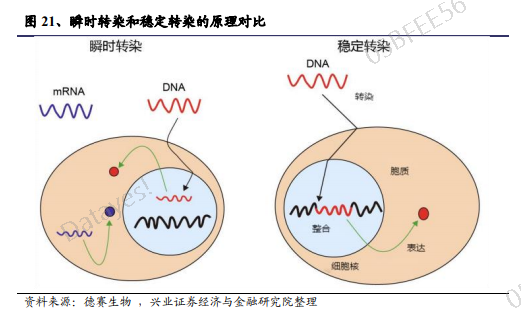 转染是指是将目的基因转染至特定哺乳动物细胞内的方法。目前工业生产中的转染方式主要有瞬时转染与稳定转染两种。