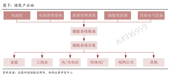 上游主要包括电池原材料及生产设备供应商等;中游主要为电池、电池管理系统、能量管理系统以及储能变流器供应商;下游主要为储能系统集成商、安装商以及终端用户等。