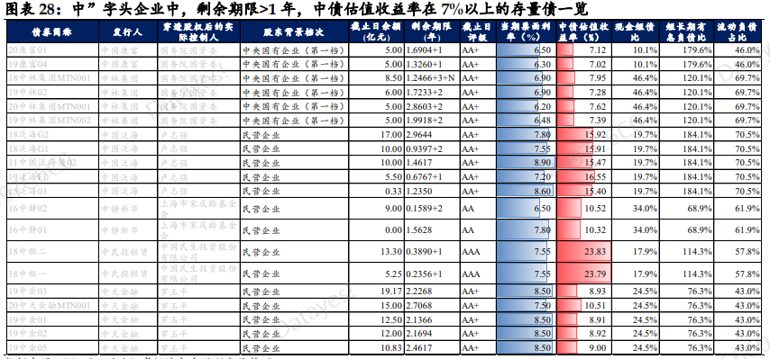 最后,萝卜君将股东背景为民企和第二档央企的“中”字头发行人列示如下,供萝卜粉丝们参考;同时,我也将“中”字头企业中,剩余期限>1年,中债估值收益率在7%以上的存量债列示在图表中: