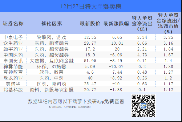 同样地,我们按照特大单资金的净流出/流通市值从大到小排序,列出了净流出/流通市值最大的10只股票: