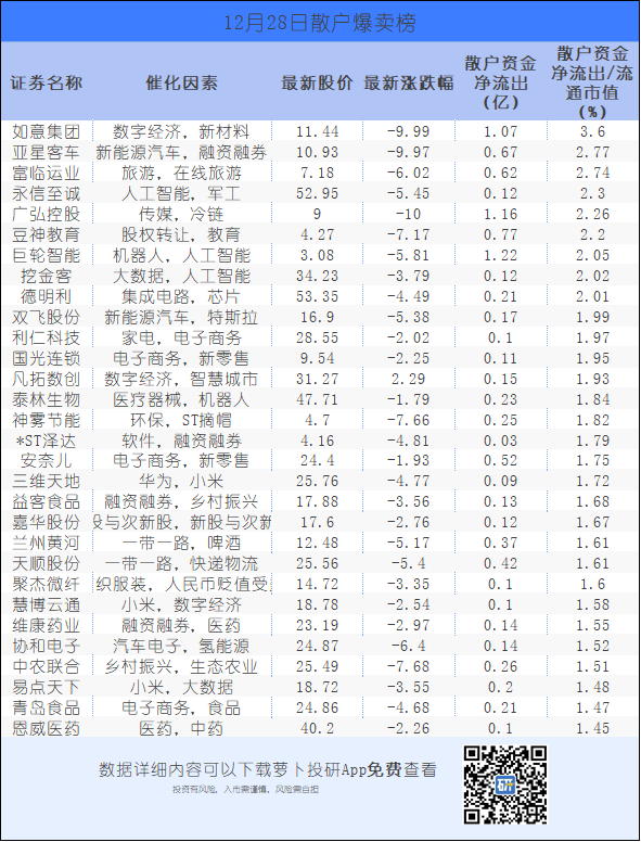 同样地,我们按照散户资金的净流出/流通市值从大到小排序,列出了净流出/流通市值最大的30只股票: