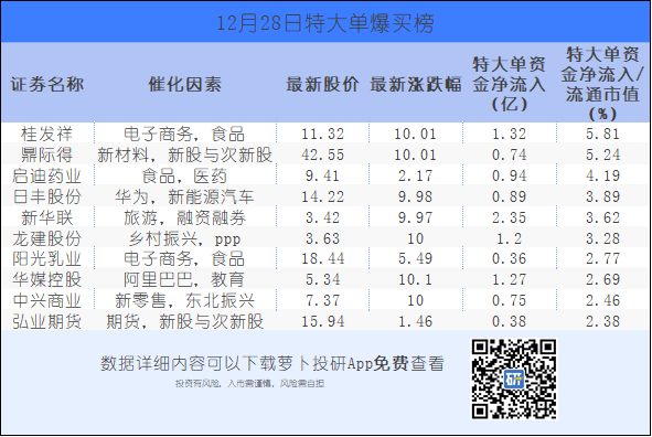 特大单资金净流入/流通市值前5的个股是桂发祥,鼎际得 ,启迪药业,日丰股份,新华联,特大单资金净流入/流通市值分别为5.81%、5.24%、4.19%、3.89%、3.62%。特大单资金净流出/流通市值前5的个股是玉龙股份,安奈儿,中锐股份,龙洲股份,广弘控股,特大单资金净流出/流通市值分别为4.42%、2.82%、1.97%、1.50%、1.27%。