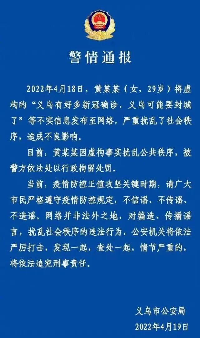 4月19日,浙江省义乌市公安局发布了一则《警情通报》称: