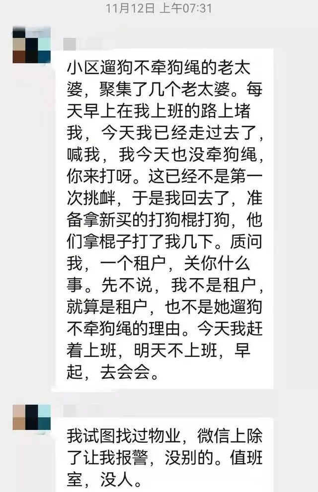 孝林说已经多次向物业和社区网格群反映无果,每天被养狗的老太太们带狗在上班的路上堵她,还挑衅说今天又没拴狗绳有本事来打。她曾购买打狗棍自卫,之后被对方辱骂、击打。一名疑似养狗人的微信群友,在不同的群里反击辱骂,并且表示自己养狗8年从未发生咬人事件,母亲遛狗没拴绳是因为狗绳被带到另外的房子里等等。