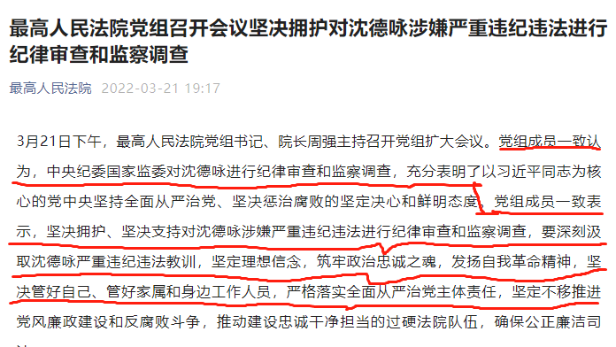 沈德咏落马的消息21号下午16时许官宣,最高法的党组也第一时间在21号下午召开了会议,并做出了坚决拥护查处的表态。