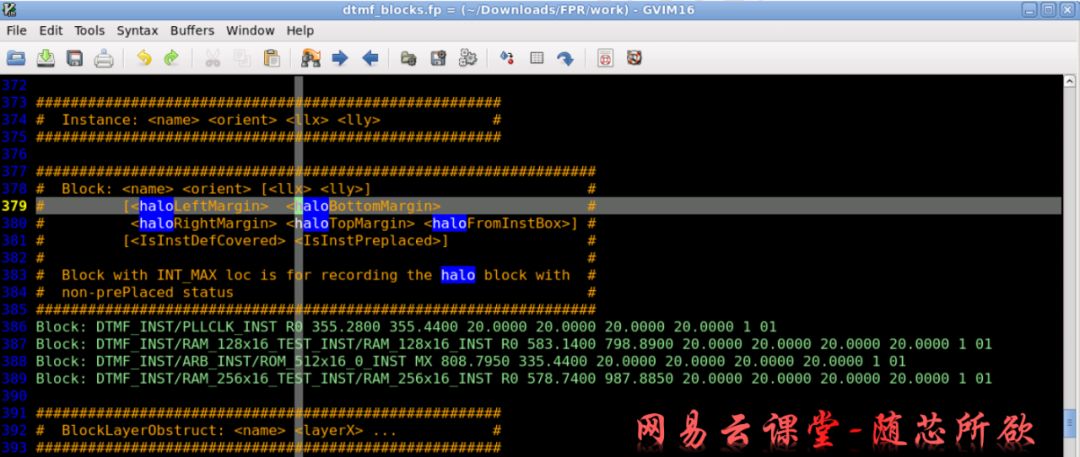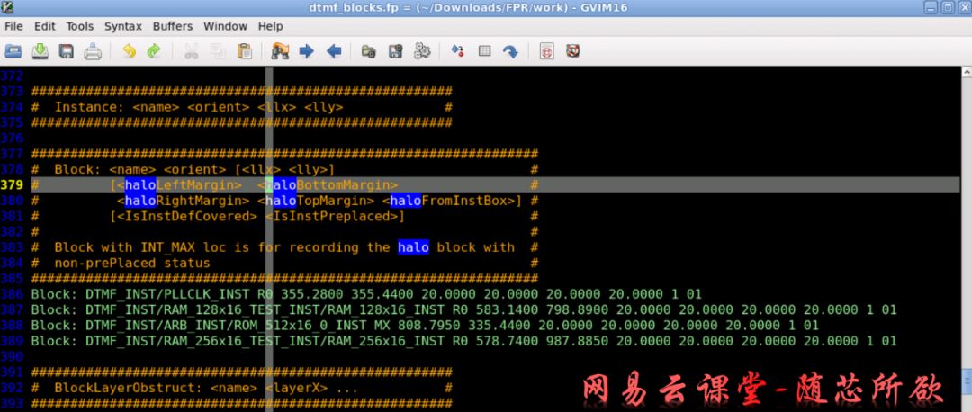 在2.1节里面我们可以通过load dtmf_block.fp文件的方式来创建Floorplan或者通过“Specify Floorplan”的方式来创建。在dtmf_blocks.fp文件里面就给每个Macro定义了Halo: