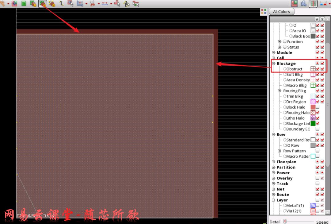 创建完毕后的效果如下,我们可以通过右侧面板中的Obstruct来控制Hard Placement Blockage的显示与否。