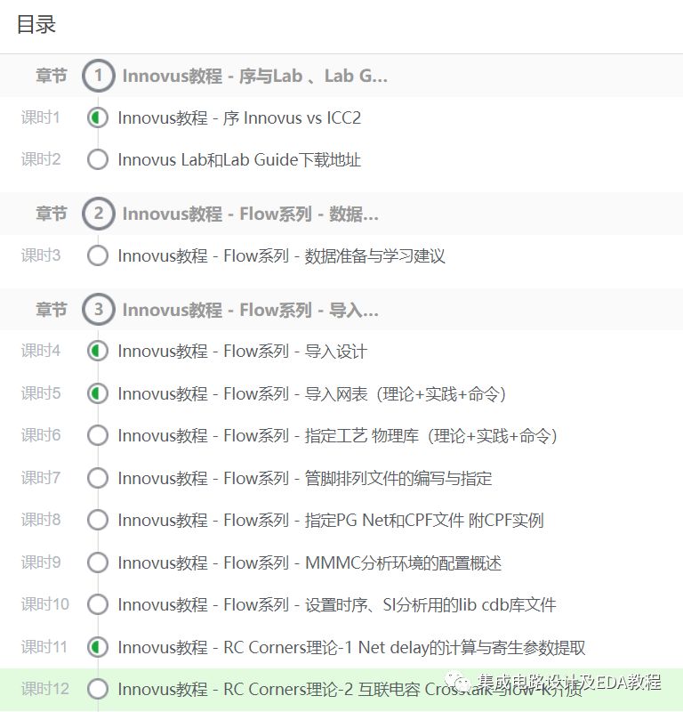 目前公众号上Innovus相关的教程并未更新太多,剩下的教程已经陆续在网易云课堂上更新了。课程正在连载中,目前已经更新到Floorplan篇章,每节内容都很详细,分为“理论+实践+命令”的组合形式,让大家在理解GUI操作的同时也清楚相应的命令,便于将来写脚本。