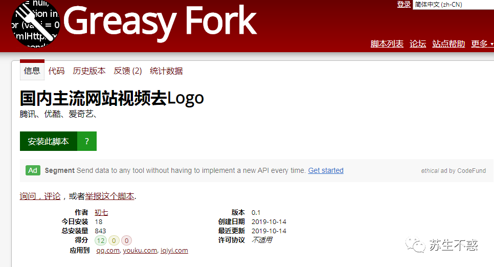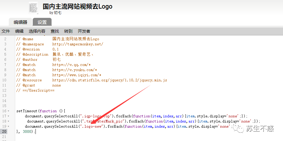 在脚本编辑里可以看到代码,其实就是将视频logo的class隐藏了,如果不想安装油猴脚本直接在控制台执行也是可以的。