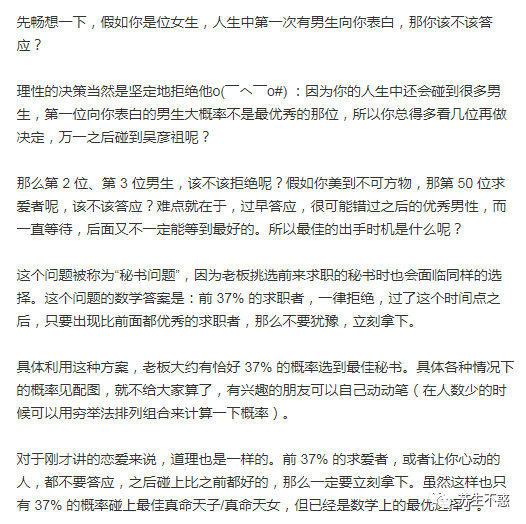 甚至还有个 37% 法则 https://weibo.com/5780974966/J1AL2xfOC