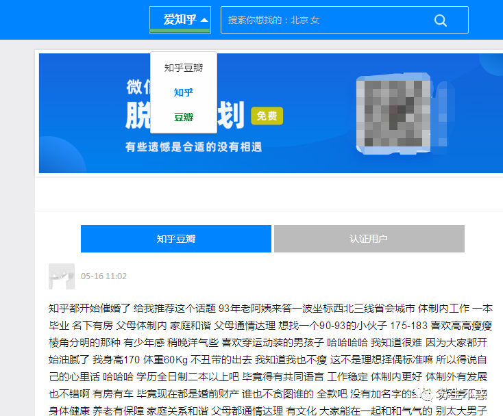 http://www.lovedouban.com/?type=1 这个网站聚合了豆瓣/合知乎两大网站的交友帖子,无广告,点击后直接进入知乎问答或者豆瓣帖子,赶紧搜索自己的理想对象吧。