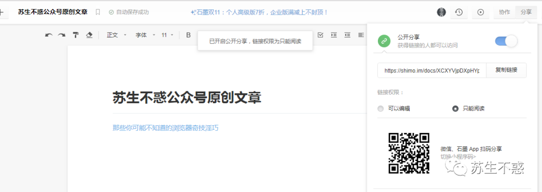 比如我新建一个文档:写好后可以分享出公开链接,设置可以编辑模式。