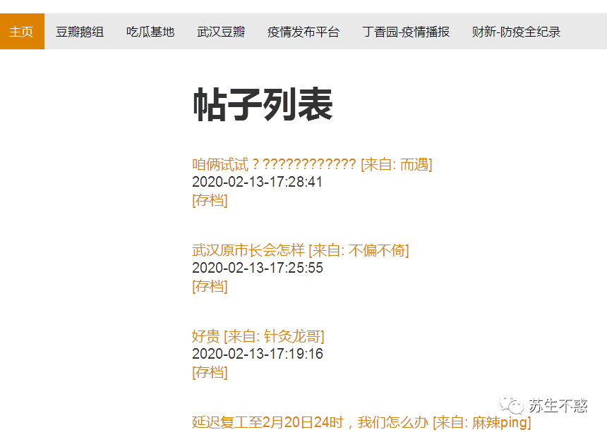 这个网站每 15 到60 分钟抓取一次所有帖子,自动保存在互联网档案馆,可以列表浏览所有(包括被删除的)帖子。https://archive.bbs.io/比如武汉豆瓣的帖子列表https://archive.bbs.io/list.php?table=wuhan