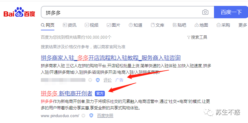 在百度搜索拼多多,第一个结果是个广告,居然不是拼多多官网,毕竟人家是给了钱的。