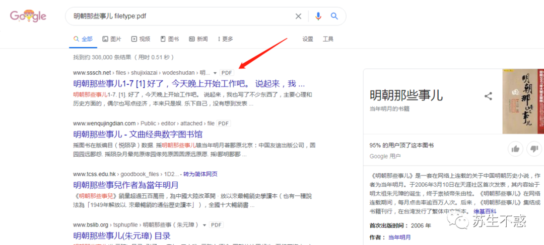 用《》来搜索书籍或者电影,比如 《明朝那些事儿》,如果搜电子书在书名关键词后加上文件格式,如 pdf/epub/mobi/azw3/txt等 比如 明朝那些事儿 filetype:pdf或者 明朝那些事儿 inurl:pdf,搜出的结果都是PDF文件。