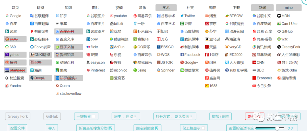 这是个油猴脚本https://greasyfork.org/zh-CN/scripts/27752-searchenginejump ,可以 方便的在各个搜索引擎之间跳转,增加可视化设置菜单,能更友好的自定义设置,修复百度搜索样式丢失的问题。
