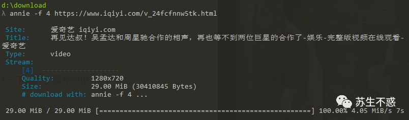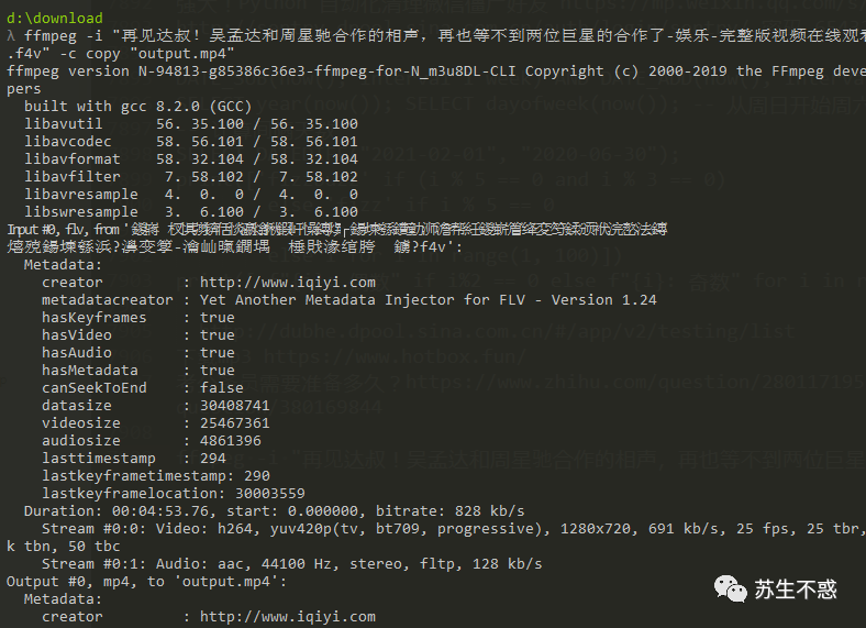 先用命令行(也可以使用之前推荐的工具)下载一个爱奇艺视频《再见达叔!吴孟达和周星驰合作的相声》。