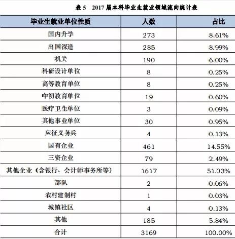2017 届本科毕业生 3264 人,就业率为 97.09%。硕士毕业生 444 人, 来自 13 个学院,分布于 36 个专业,441 人就业,就业率为 99.32%。