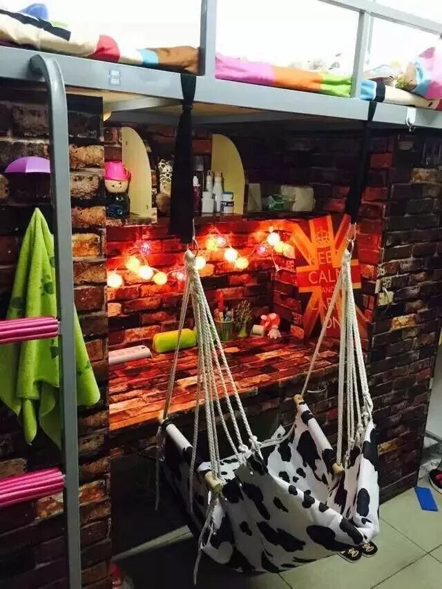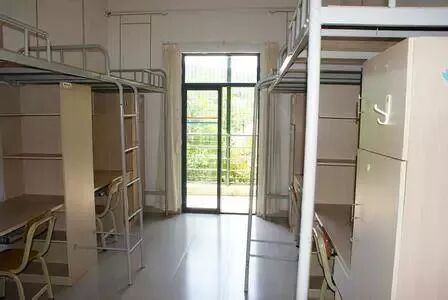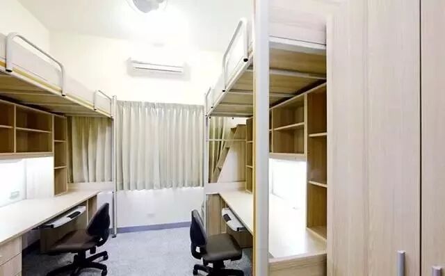 女生宿舍是六人宿舍,室内有卫浴。有空调,有电扇,装了火灾报警器,非上床下桌,有阳台。男生宿舍则是4人一间,上床下桌,每天到校区要过一个天桥,每个宿舍好像没有独立卫浴,一层楼大概有几个。