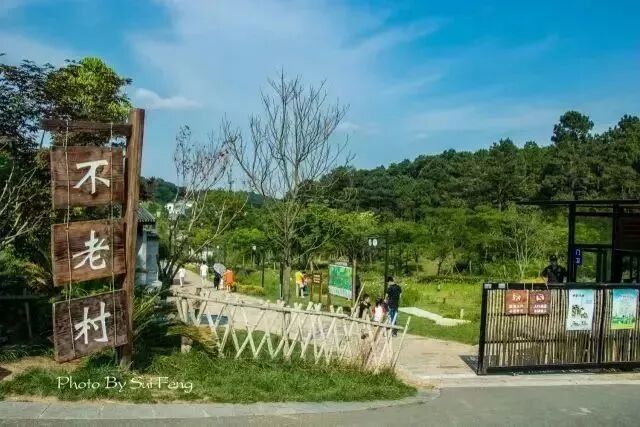 不老村由白墙黛瓦的屋舍、草坪、花丛和水塘组成。周末也没有很多人,三三两两的游人闲逛在村庄里,悠闲的美景让每个人都放慢了脚步。