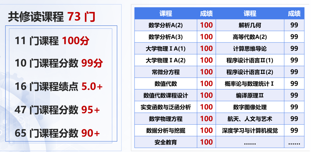 三年来,周长宇的平均绩点达到“可怕的”4.9,大一下、大二上更是连续两个学期必修绩点5.3,连续5个学期位列专业第一,推免综合成绩位列全院第一,打破理学院历史最高纪录。在2019年学业奖学金评审中,他以必修绩点5.3、平均绩点5.1排名全校第一。之所以会有这样令人惊叹的成绩,周长宇介绍,是因为难度比较大的A类课程有加分5分的机制,而他在16门A类课程中都拿到了5.0+的绩点。