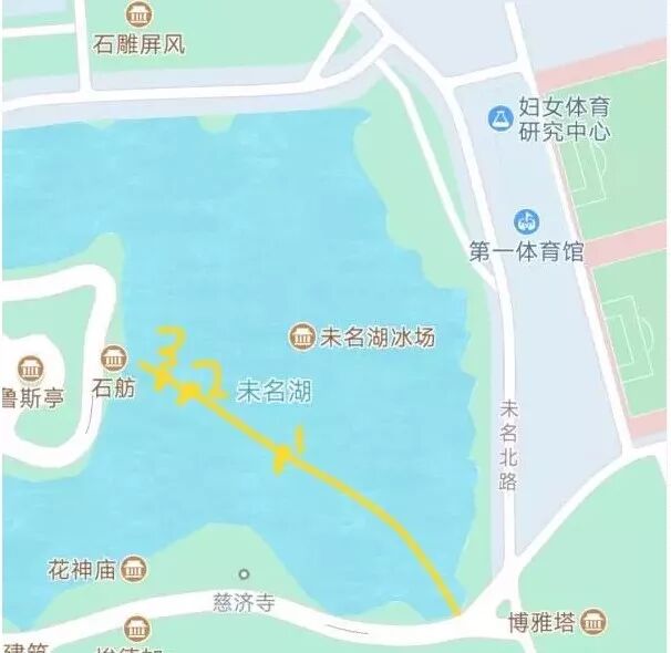 只可惜好景不长,在我离石舫只有 5 米左右,胜利在望的时候(图中位置 3),冰面裂开,我掉进水里。