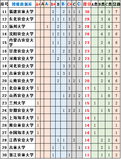 山东农业大学、湖南农业大学、西南大学、福建农林大学、东北农业大学、扬州大学、沈阳农业大学、内蒙古农业大学、甘肃农业大学、河南农业大学、河北农业大学、吉林农业大学、云南农业大学、北京林业大学、山西农业大学、兰州大学、安徽农业大学、上海海洋大学、南京林业大学、中国海洋大学、江西农业大学、吉林大学、浙江农林大学等。
