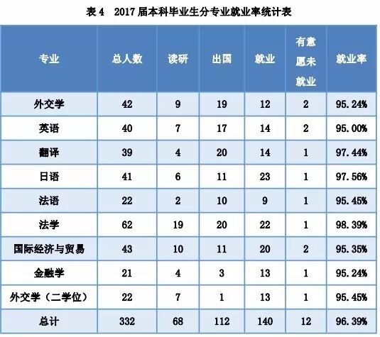 2017 届本科毕业生共有 332 人(不含留学生和港澳台学 生),其中本科生 310 人,外交学专业第二学士学位生 122 人。