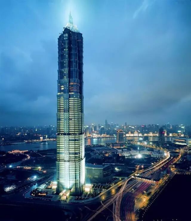 金茂大厦,上海地标,高度420.5米,是目前世界第四、中国第二高楼,位于浦东陆家嘴,与外滩风景区隔江相望。