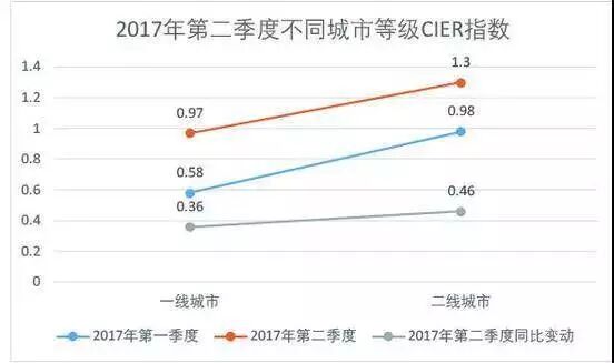 2017年前两个季度不同等级城市的CIER指数(中国就业市场景气指数)对比也反映了二线城市人少职位多的情况。CIER大于1时,表示就业环境比较缓和,CIER小于1时,表示就业形势比较严峻,竞争者很多。