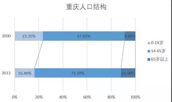 有学者推测,2020年重庆老龄化程度将达到12.6%。从2000年到2010年,重庆的年轻劳动力比重下降了7.2%,但是老年劳动力却增加了113.09万人,而这些老年劳动力将在十年内逐渐退休,享受由越来越少的年轻劳动力提供的服务。老年劳动人口增多,生育率却在下降,2014年,重庆的生育率为1.164,要知道能保证世代更替最低生育率是2.1。