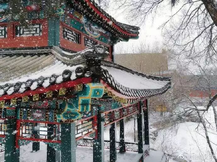 雪中的老斋舍韵味十足,白雪朱窗绿瓦,老斋舍古朴别致展现的淋漓精致。