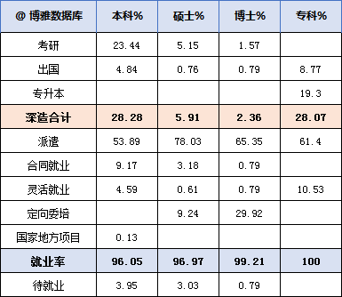 其中,博士、硕士、本科、专科毕业生 就业率分别为 99.21%、96.97%、96.05%、100.00%。