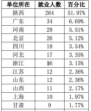 参加工作的学生中超过一半在陕西就业。其余主要流向广东、北京、上 海、浙江。