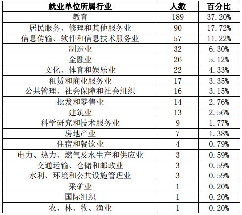 从事教育行业的相关职业的学生超过 37%;其他人数较 多的有居民服务业、信息产业、制造业、金融业等。