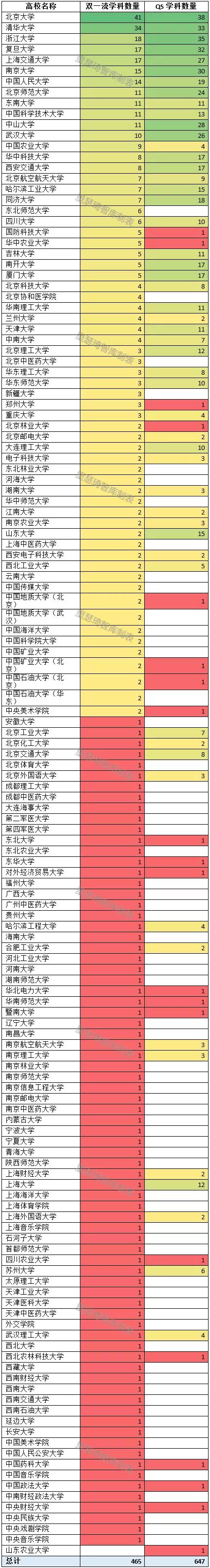 2019年QS公布的学科榜单中,中国高校的47个学科共计647次入选,进入QS学科榜单的学科次数比进入“双一流”建设的学科次数多182次。