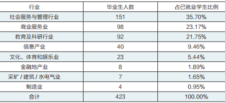 排在前三位的是社会服务与管理行业、商业服务业、 教育及科研行业。