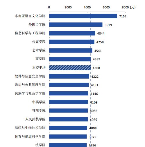 其中,本科毕业生月收入较高的学院是东南亚语言文化学院(7152 元),月收入较低 的学院是化学化工学院(3580 元)。
