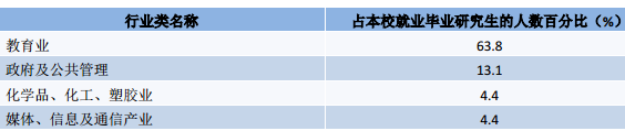 研究生就业量较 大的行业类为教育业(63.8%)、政府及公共管理(13.1%)等。