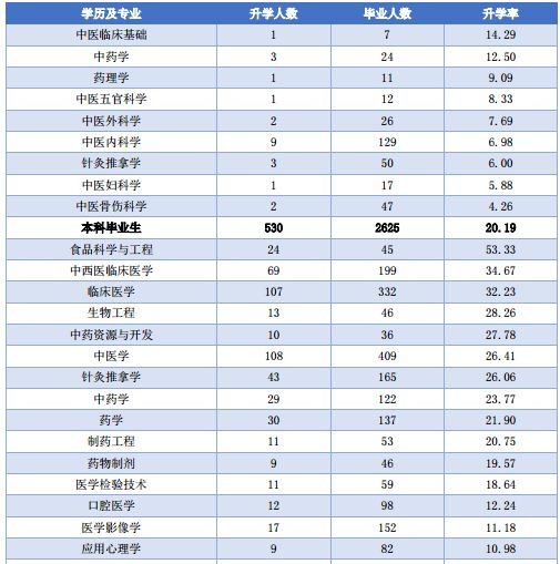 本科毕业生中升学率最高的为 食品科学与工程专业,升学率为 53.33%;升学人数最多的为中医学,升学率为 26.41%。