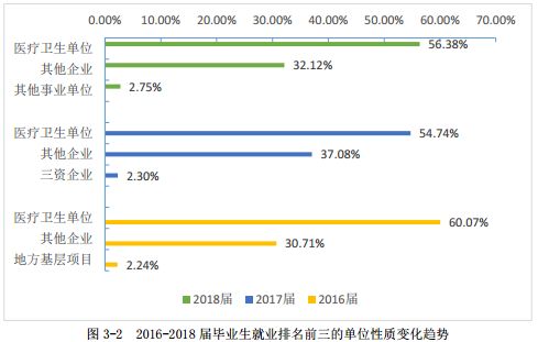 性质主要为“医疗卫生单位”,占比达到 56.38%。 其余依次为:民营企业32.12%,其他事业单位2.8%,基层项目2.7%,高校2%。
