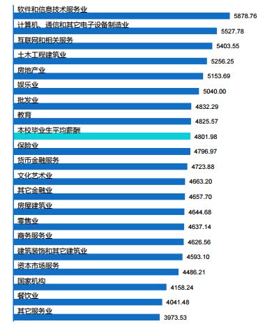 选择在“软件和信息技术服务业”就业的毕业生薪酬 优势较高,月均收入 5878.76 元;而选择在“其它服务业”就业的毕业生月均收入水 平相对较低,为 3973.53 元。