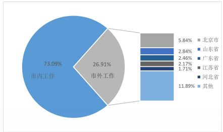 市外就业人数较多的地区为北京市(5.84%)、山东省(2.84%)、 广东省(2.46%)、江苏省(2.17%)和河北省(1.71%)。