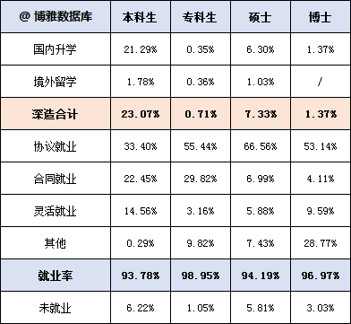 本科毕业生、专科毕业生、硕士毕业生和博士毕业生的就业 率分别为 93.78%、98.95%、94.19%和 96.97%。