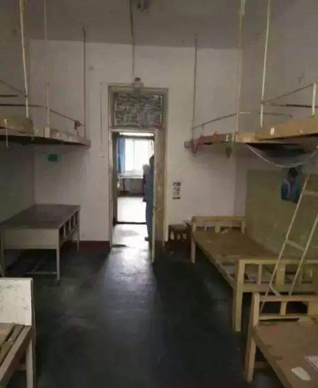 这是6人间女生宿舍,和目前主流的“上床下桌”四人间大学宿舍相比,确实寒酸不少。最明显的缺点是不方便,整间宿舍只有一张桌子,而衣柜书橱之类的必备设施是不存在的。